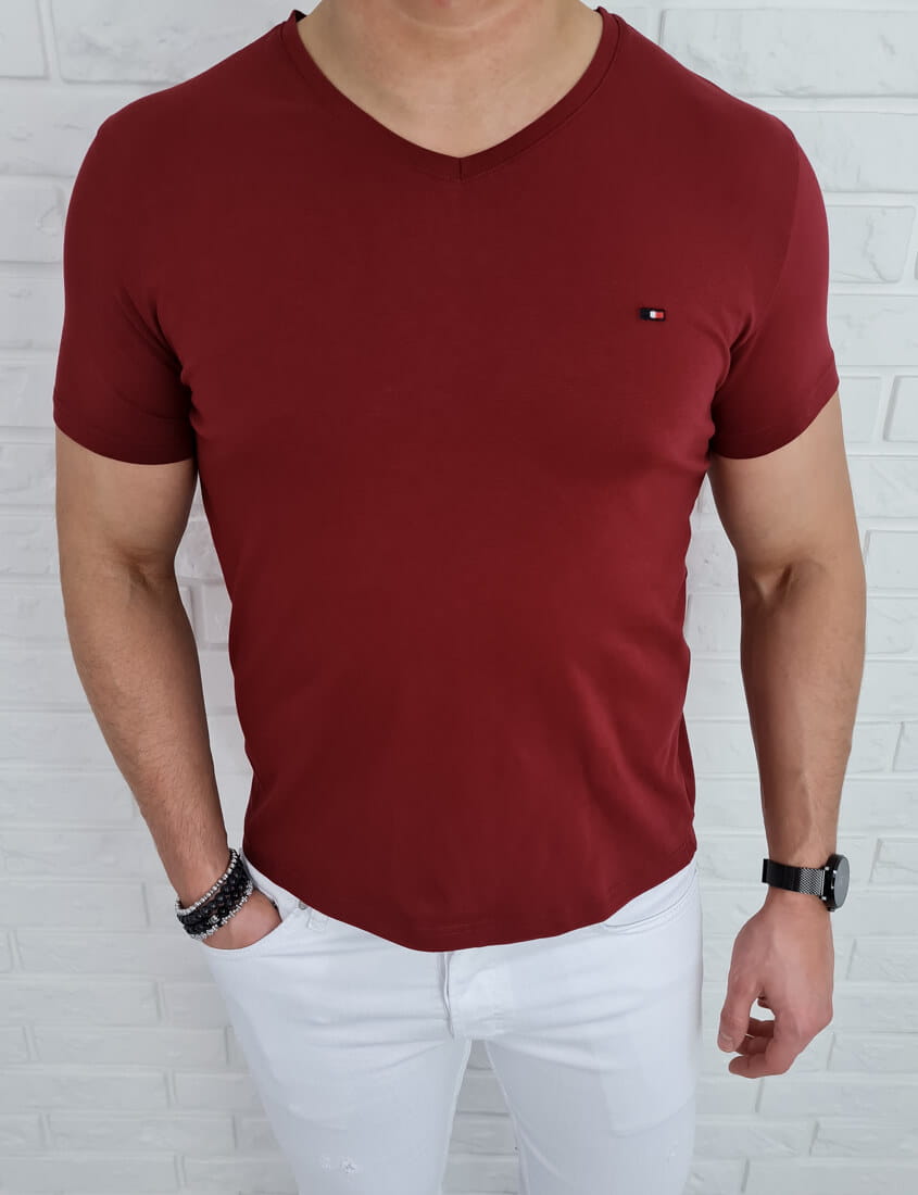 Koszulka meska bez nadruku w serek bordowa 7063 Stylovy